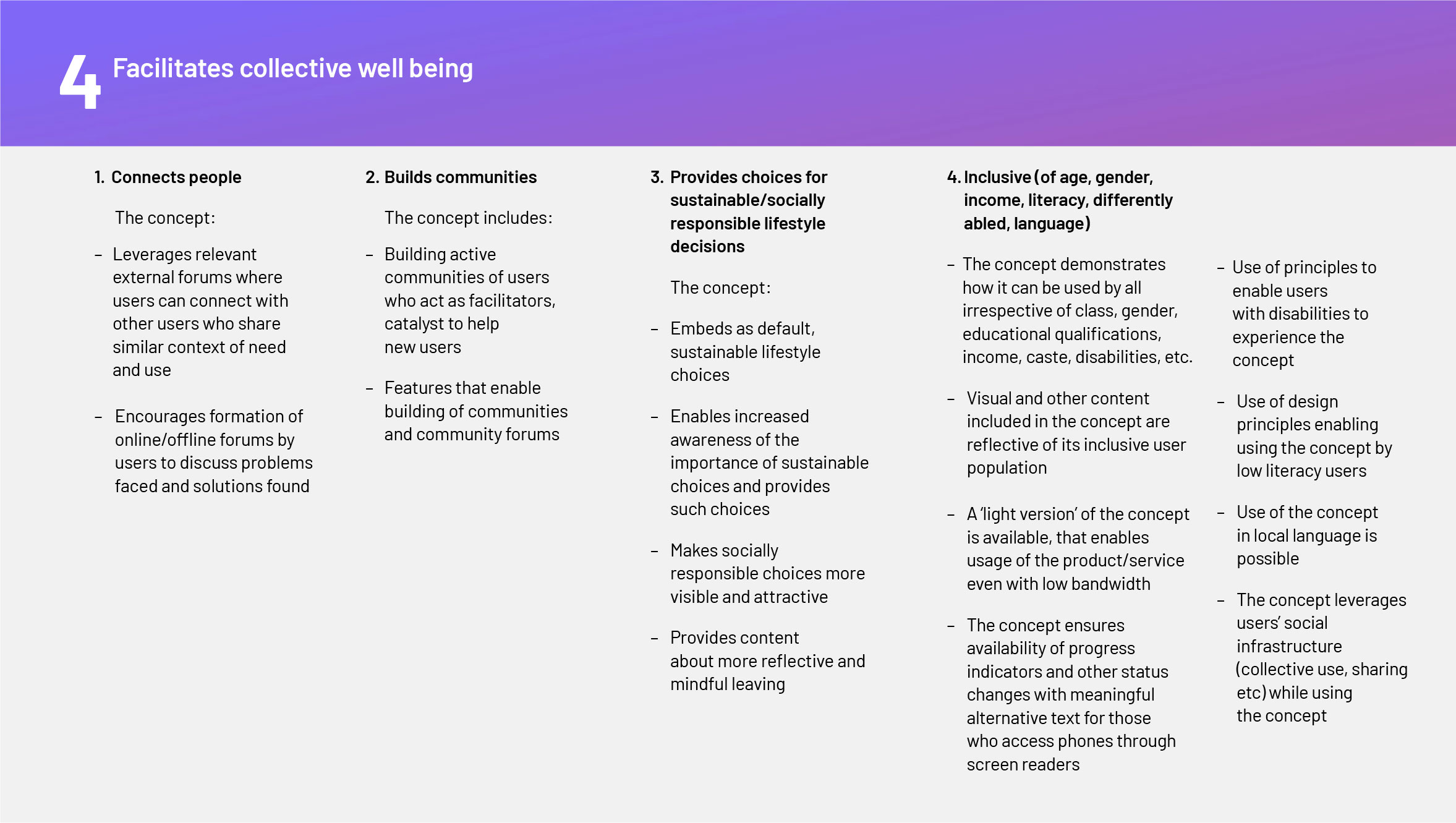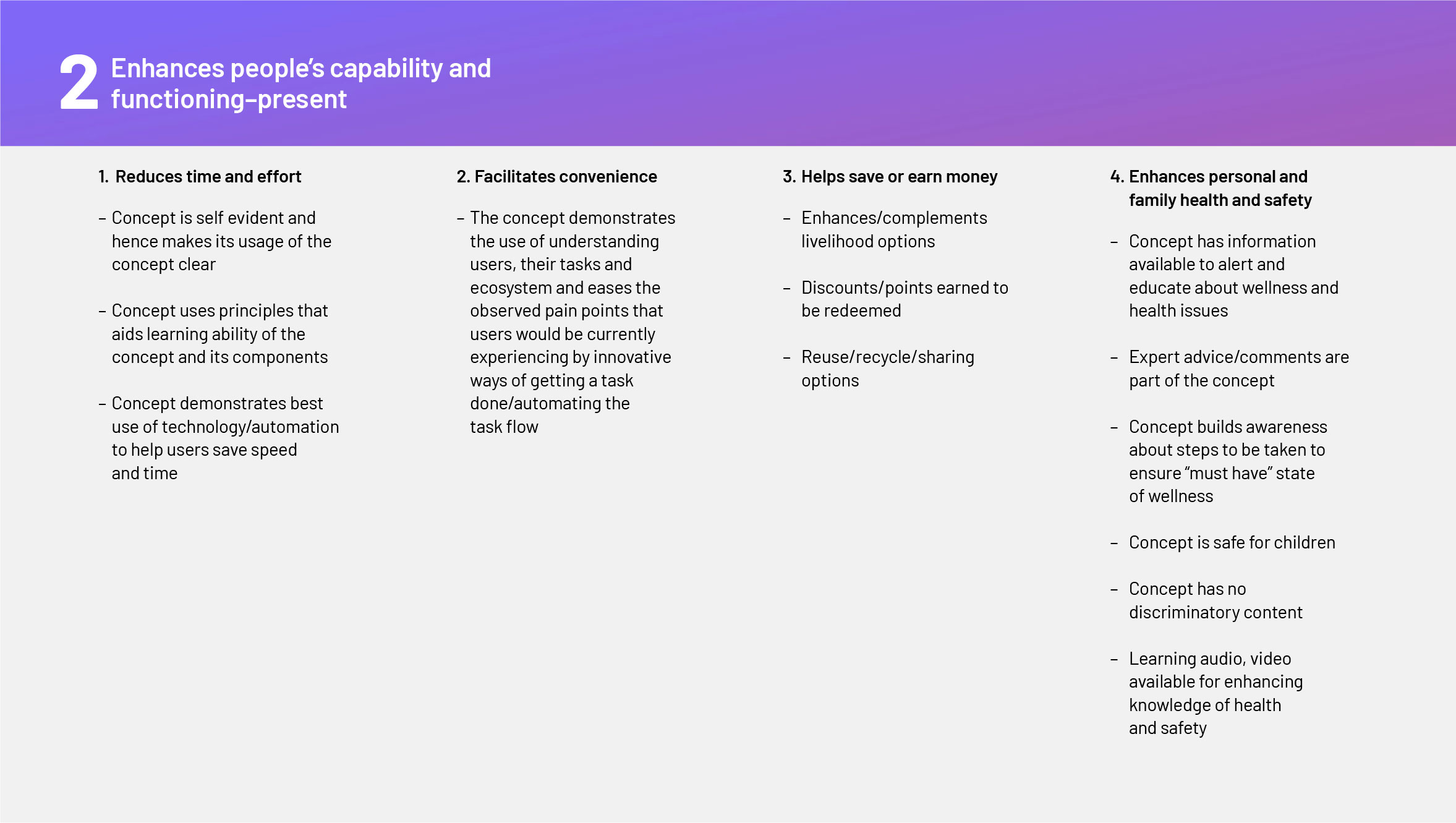 All these dimensions shape people’s well-being, and yet conventional income measures miss many of these. Taking inspiration from these dimensions, this is a list of parameters that could form the basis of a more holistic design index. These parameters could be used to evaluate whether a UX design concept/ prototype/fully working product does the following for its users? The design could be scored based on how it fares on each of the items below.