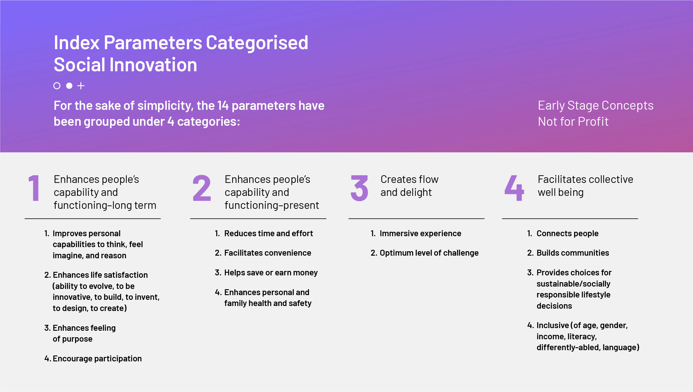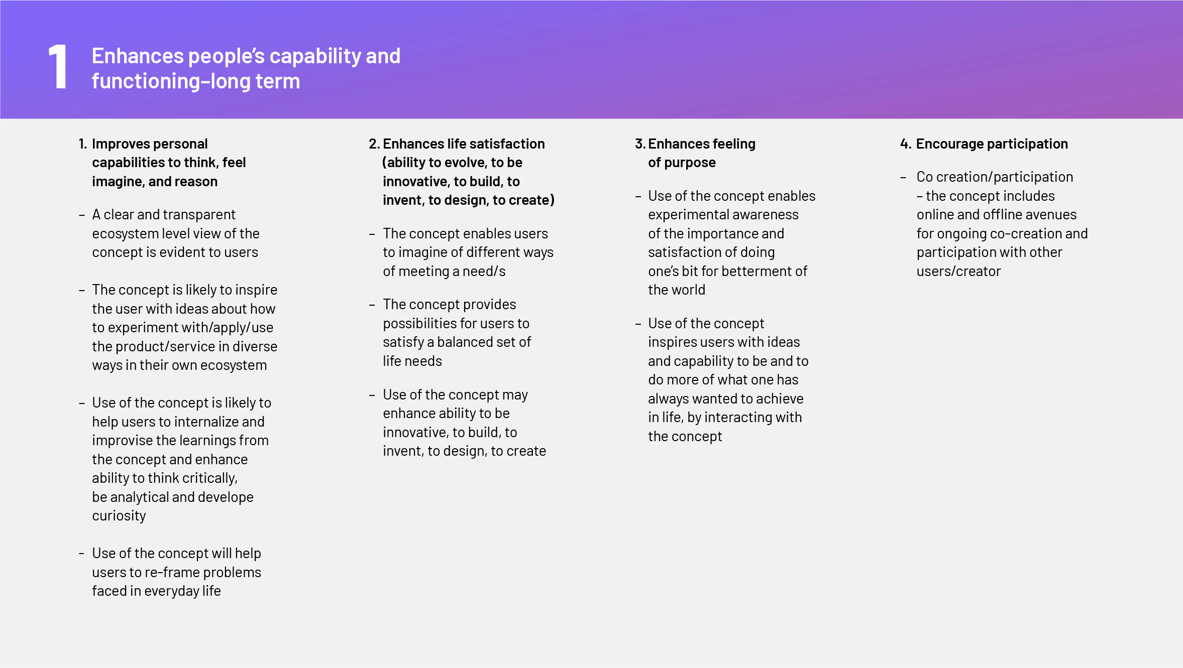 All these dimensions shape people’s well-being, and yet conventional income measures miss many of these. Taking inspiration from these dimensions, this is a list of parameters that could form the basis of a more holistic design index. These parameters could be used to evaluate whether a UX design concept/ prototype/fully working product does the following for its users? The design could be scored based on how it fares on each of the items below.